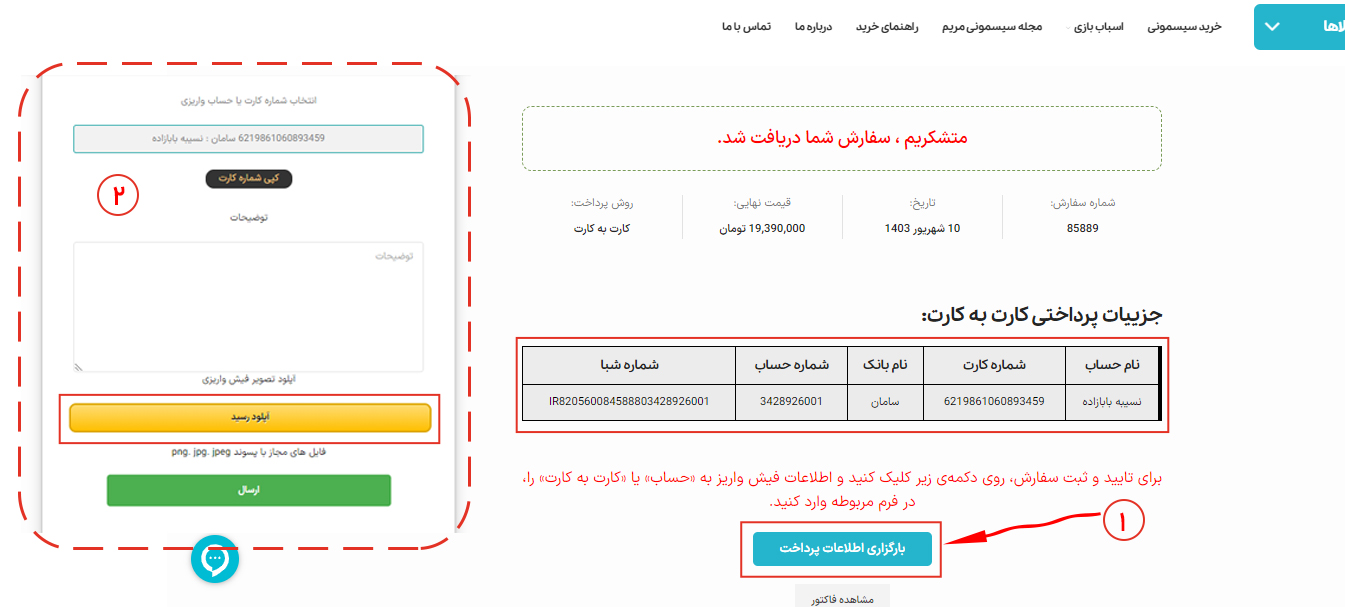 ۱۲. تبریک میگوییم. سفارش شما دریافت شد. جهت تکمیل سفارش، مبلغ مورد نظر را به شماره کارت مقصد واریز فرمایید. حال با کلیک روی دکمه بارگذاری اطلاعات پرداخت، پنجرهای برای شما باز خواهد شد. کافی است با کلیک روی دکمه «آپلود رسید»، رسید واریزی خود را بارگذاری فرمایید. توجه داشته باشید عدم بارگذاری رسید واریزی، بهمعنای عدم پرداخت وجه خواهد بود.