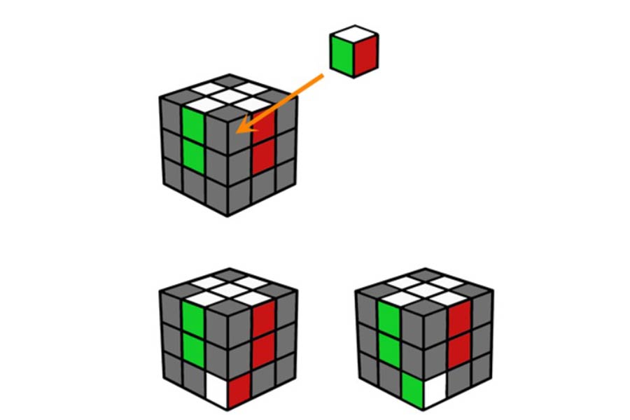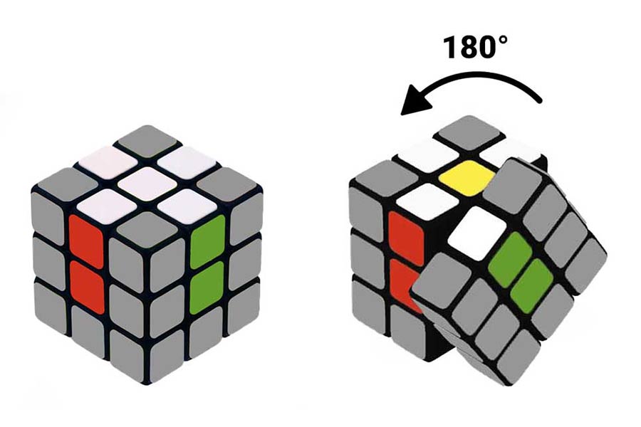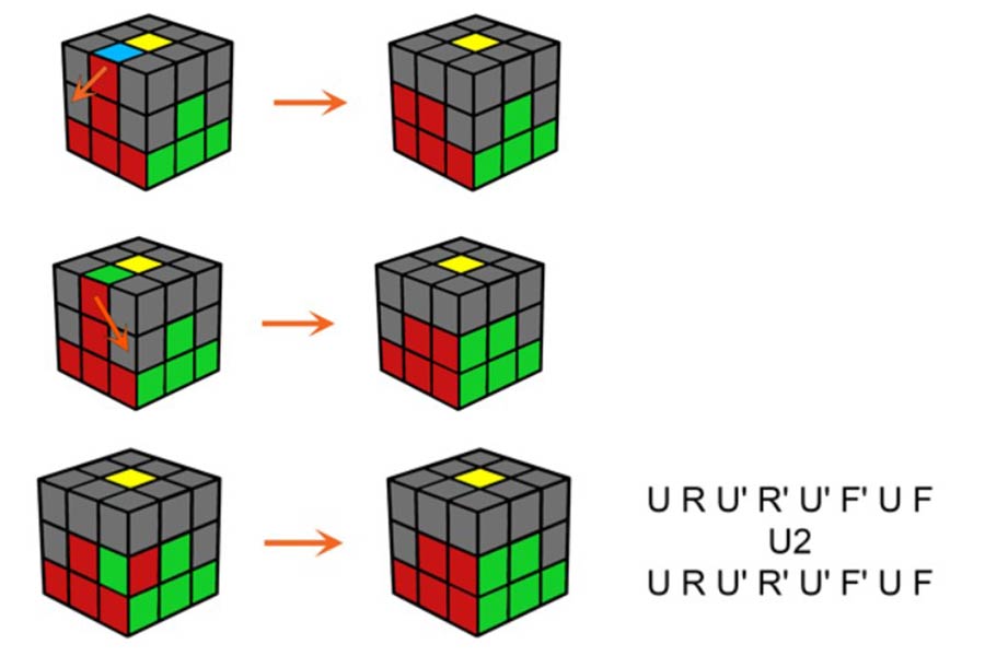 مهم نیست مکعب را چطور نگه دارید، فقط یکی از دو الگوریتم بالا را اجرا کنید. با این کار، یکی از لبهها در جای درستش قرار میگیرد و شما به حالت اول میرسید و میتوانید ادامه مراحل را دنبال کنید.
