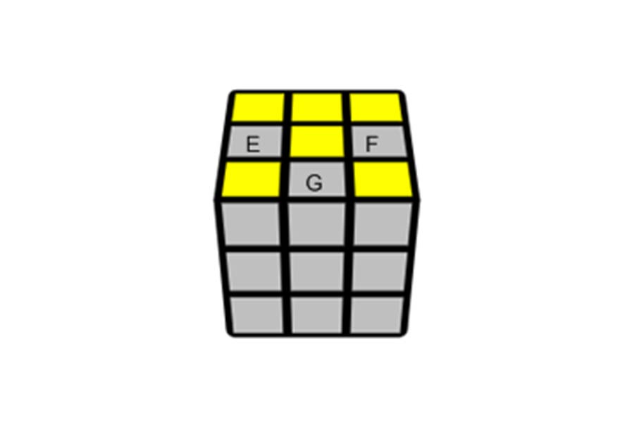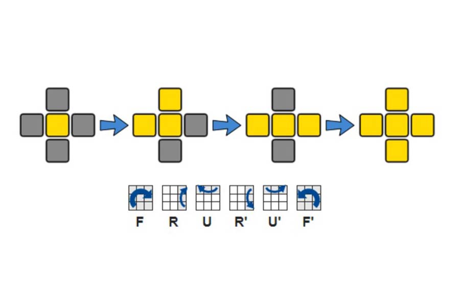 حالا که لایههای اول و میانی کامل شدهاند، اولین هدف در این لایه، ساختن یک صلیب زرد در بالای مکعب بر اساس (الگوریتم اصلی: F R U R’ U’ F’) است. مکعب را طوری در دست بگیرید که مرکز زرد رو به بالا باشد. حالا به لایه زرد نگاه کنید. ممکن است یکی از سه حالت زیر را ببینید: