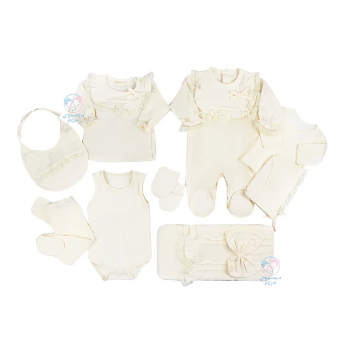 - شامل ۱۰ تکه مختلف، شامل بادی، بلوز، شلوار، کلاه، دستکش و پتو است؛